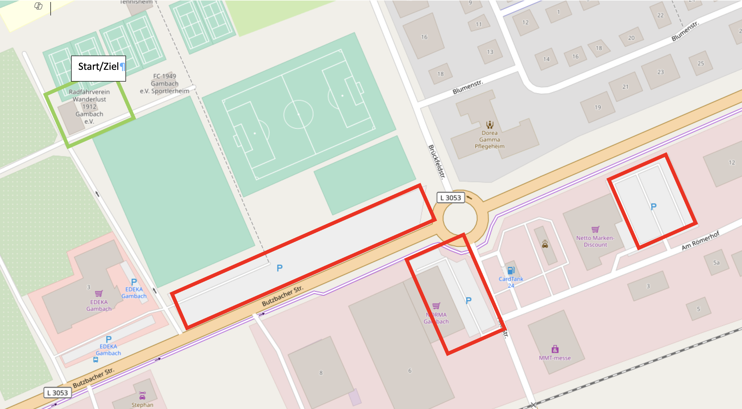 - K1: Parkplatz am Rossmann in Hungen (Untertorstr. 42a); wird von allen Touren angefahren (zweimal bei RTF 1 + 2 und bei GTF 1); Abbau um 14 Uhr